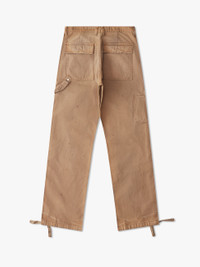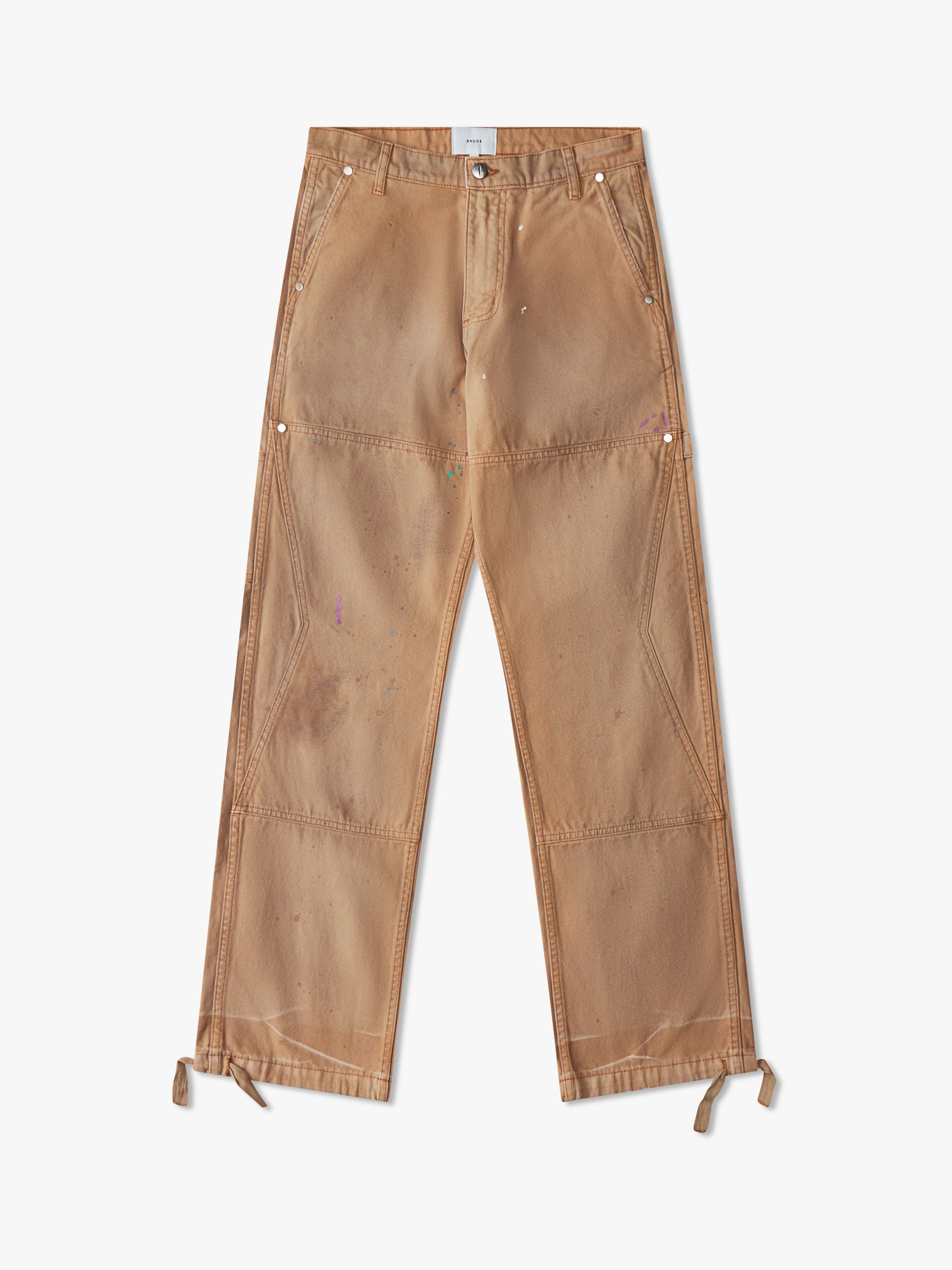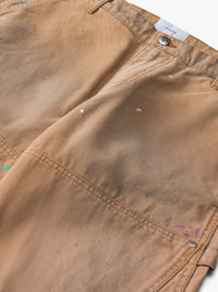 Premium cotton painter pant features a mid-rise and slightly flared design, offering a modern silhouette. The cotton twill construction is highlighted by tonal topstitching in a paneled design. Adorned with custom RHUDE hardware. Featuring a zip fly with button closure, with two side pockets and two rear flap pockets. The distressed paint detailing on the front and rear adds a unique touch. Adjustable cuffs with raw-cut details provide a personalized fit. SIZING Standard fit - We recommend taking your standard size.