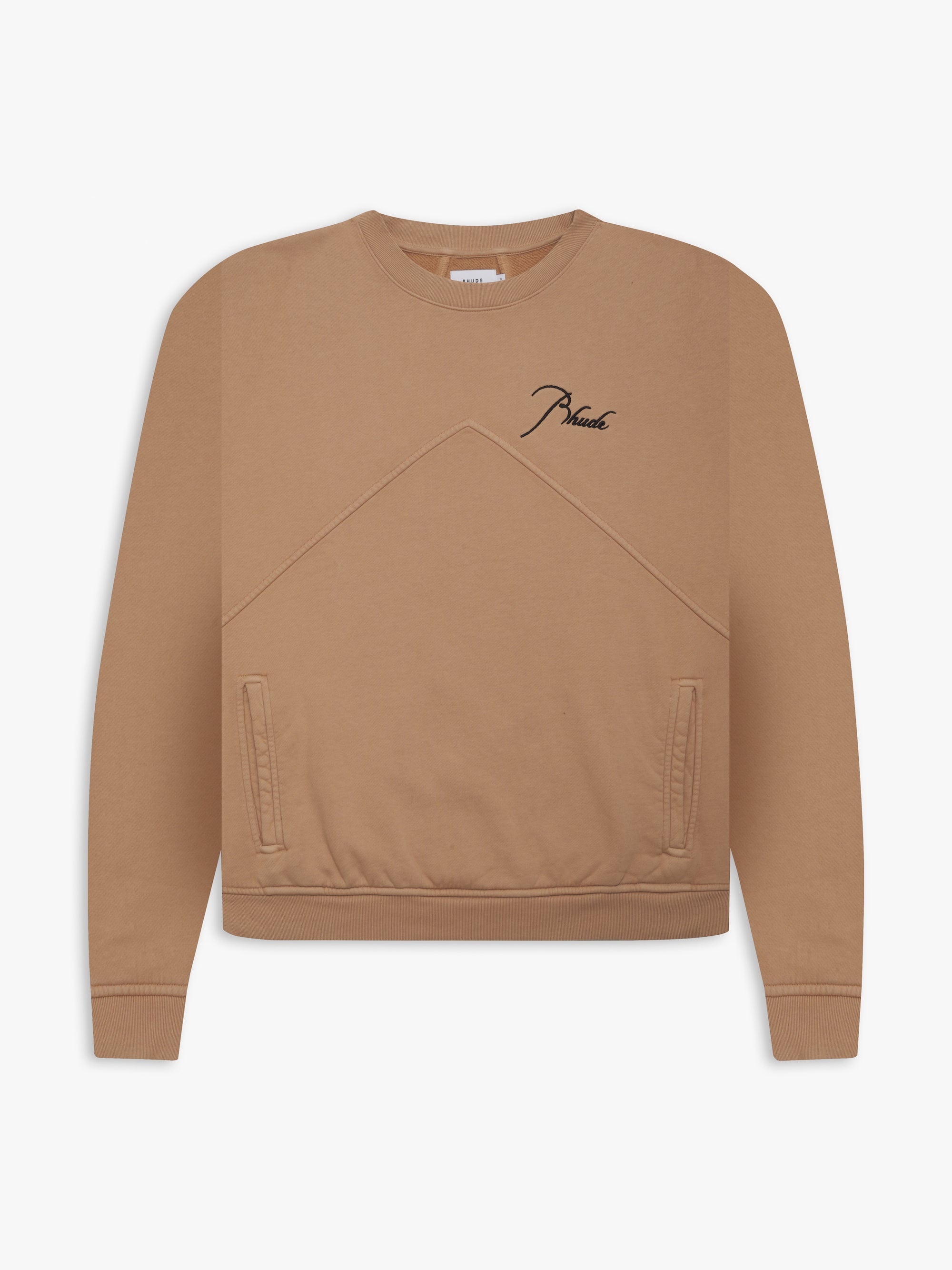 LONG SLEEVE FRENCH TERRY CREW WITH RHUDE SIGNATURE LOGO EMBROIDERED ON THE FRONT AND BACK. FEATURING A KANGAROO FRONT POCKET AND DROPPED SHOULDERS. CARE 100% COTTON MACHINE WASH COLD STANDARD FIT.