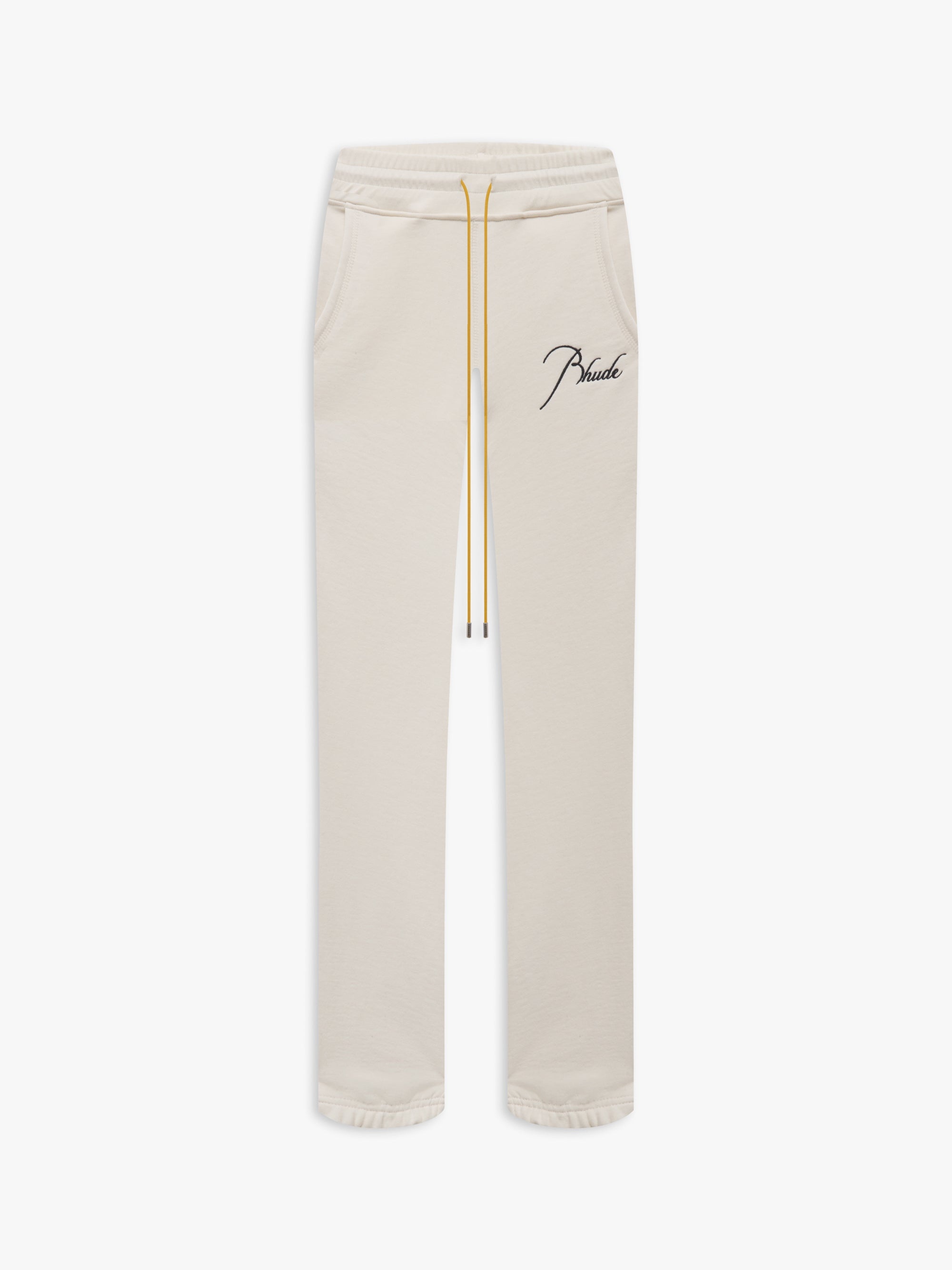 HEAVYWEIGHT SWEATPANT WITH SIGNATURE RHUDE SCRIPT EMBROIDERED ON THE FRONT FEATURING OUR SIGNATURE MUSTARD DRAWSTRINGS. CARE 100% COTTON DRY CLEAN ONLY.