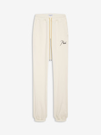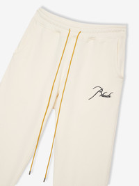 HEAVYWEIGHT SWEATPANT WITH SIGNATURE RHUDE SCRIPT ON THE FRONT FEATURING OUR SIGNATURE MUSTARD DRAWSTRINGS. CARE 100% COTTON DRY CLEAN ONLY. STANDARD FIT. SIZING WE RECOMMEND TAKING YOUR STANDARD SIZE.
