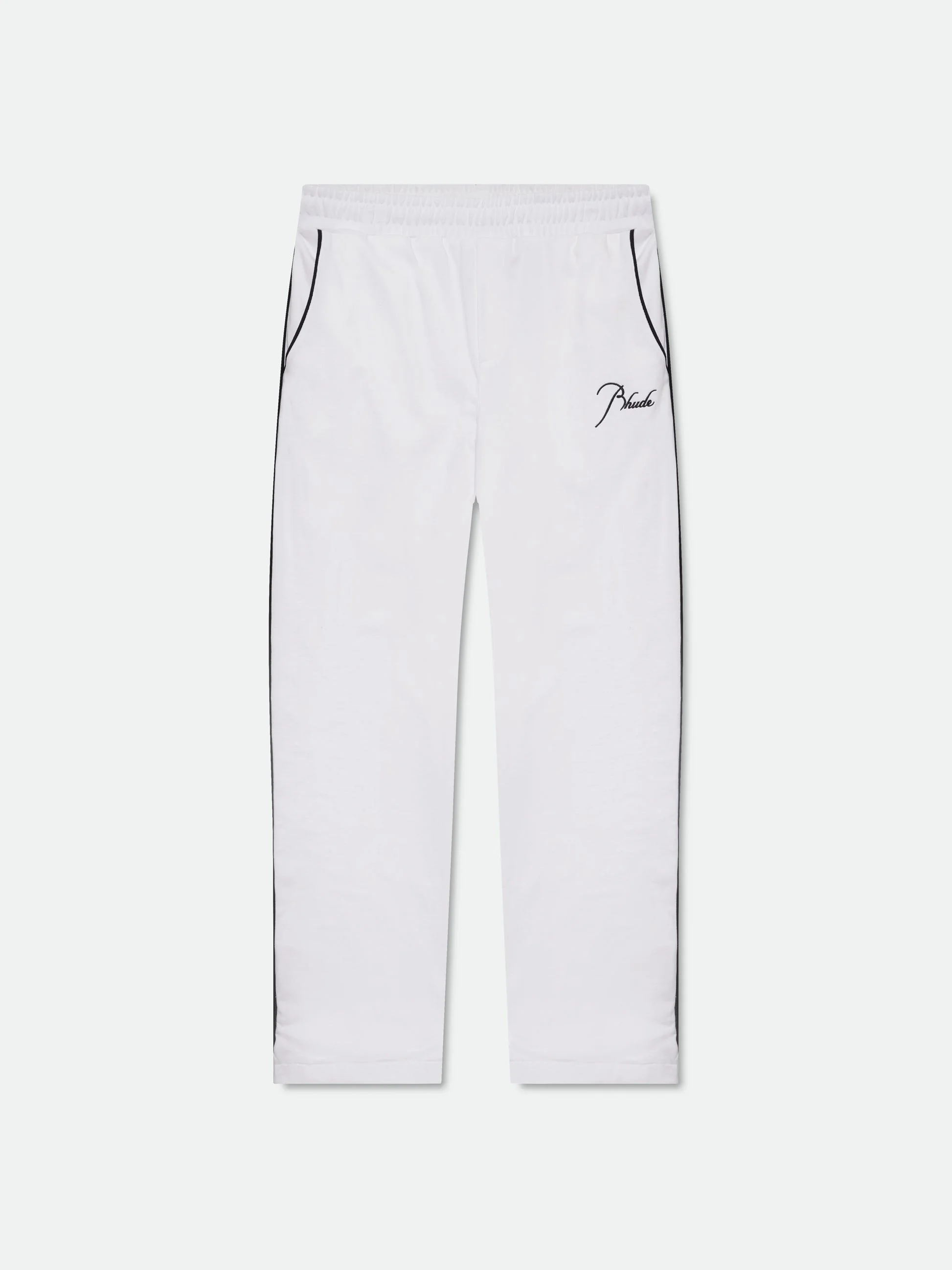 Heavyweight PJ pant with signature Rhude script logo embroidered on the front featuring piping details including on welt pockets on the side and back. 100% COTTON