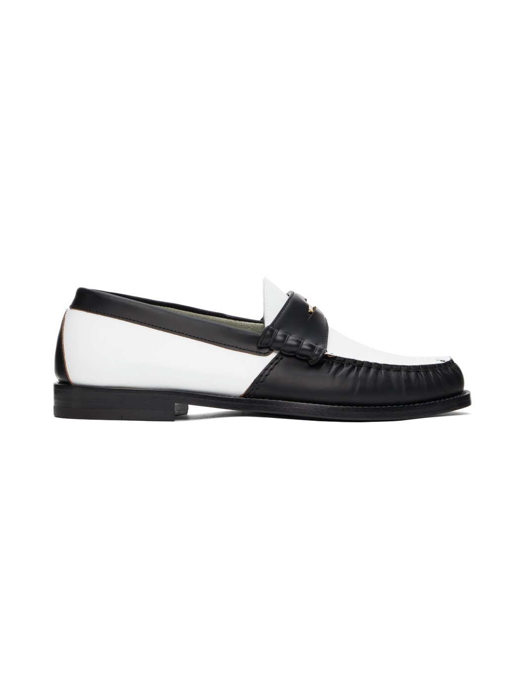Buffed leather loafers in white and black. Contrast stitching in black at round moc toe. Strap with coin accent at vamp. Suede lining in off-white. Tonal stacked leather heel. Tonal leather outsole. Gold-tone hardware. Supplier color: White/Black Leather.