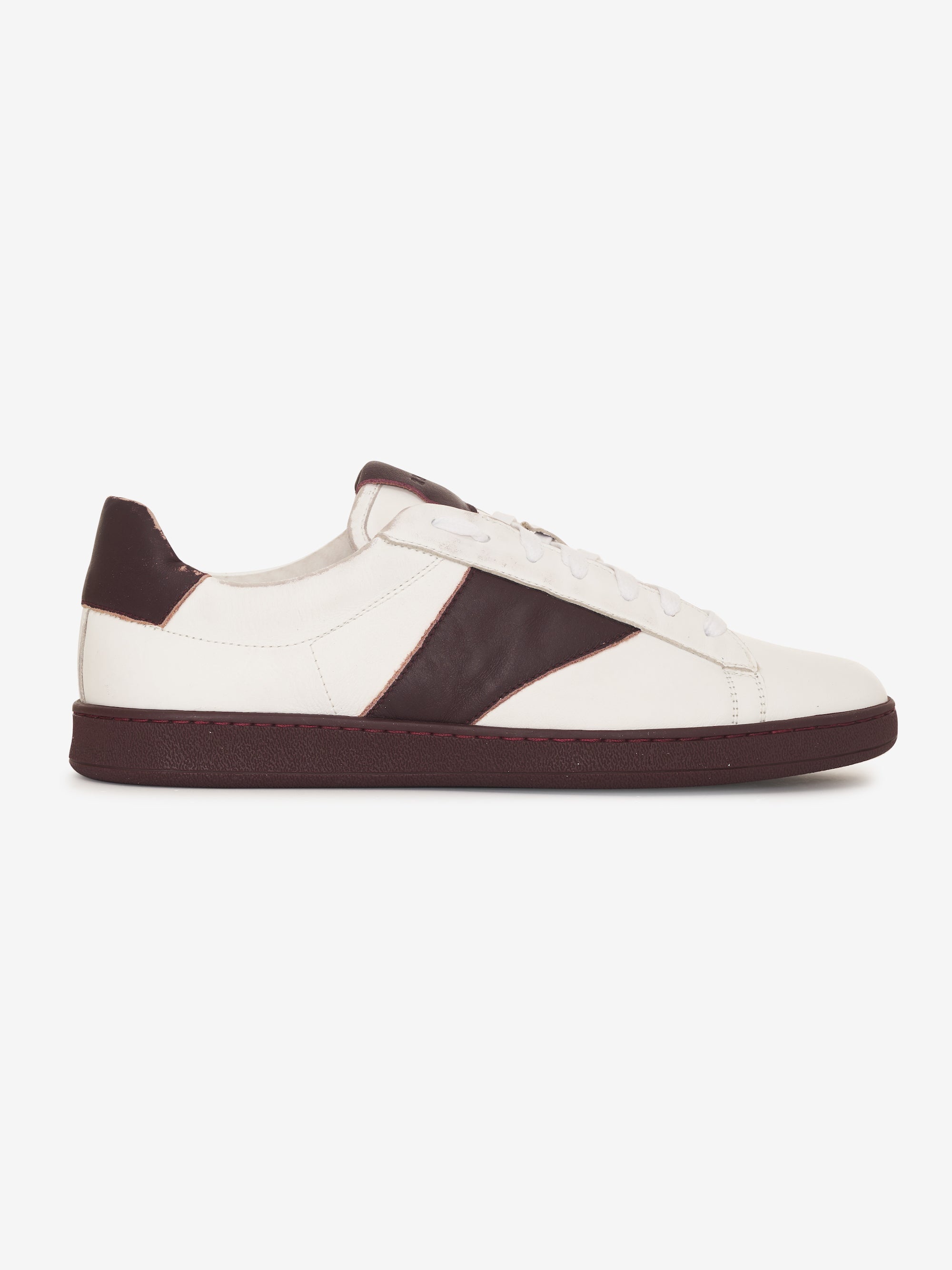 LOW TOP PANELED SNEAKERS IN WHITE AND NAVY WITHDISTRESSED ABRASIONS AND IMPERFECTIONS THROUGHOUT. LEATHER LOGO PATCH AT TONGUE, FEATURES A TEXTURED RUBBER MIDSOLE AND TREADED RUBBER OUTSOLE, AND LACE UP CLOSURE. CARE RUBBER SOLE, 85% UPPER CALF LEATHER 15% UPPER POLYETHERANE 100% LINING PIG LEATHER
