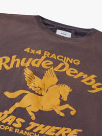 Custom-vintage fit cotton tee shirt with a ribbed neckline and short sleeves. Features RHUDE derby graphic design printed on front. Each garment is finished with our signature sundry process. CARE INSTRUCTIONS 100% COTTON DRY CLEAN ONLY WE RECOMMEND TAKING YOUR STANDARD SIZE