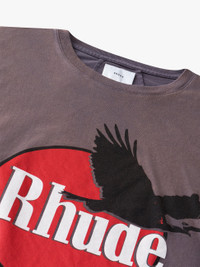 Custom-vintage fit cotton tee shirt with a ribbed neckline and short sleeves. Features RHUDE Eagle graphic design printed on front. Each garment is finished with our signature sundry process. CARE INSTRUCTIONS 100% COTTON DRY CLEAN ONLY WE RECOMMEND TAKING YOUR STANDARD SIZE