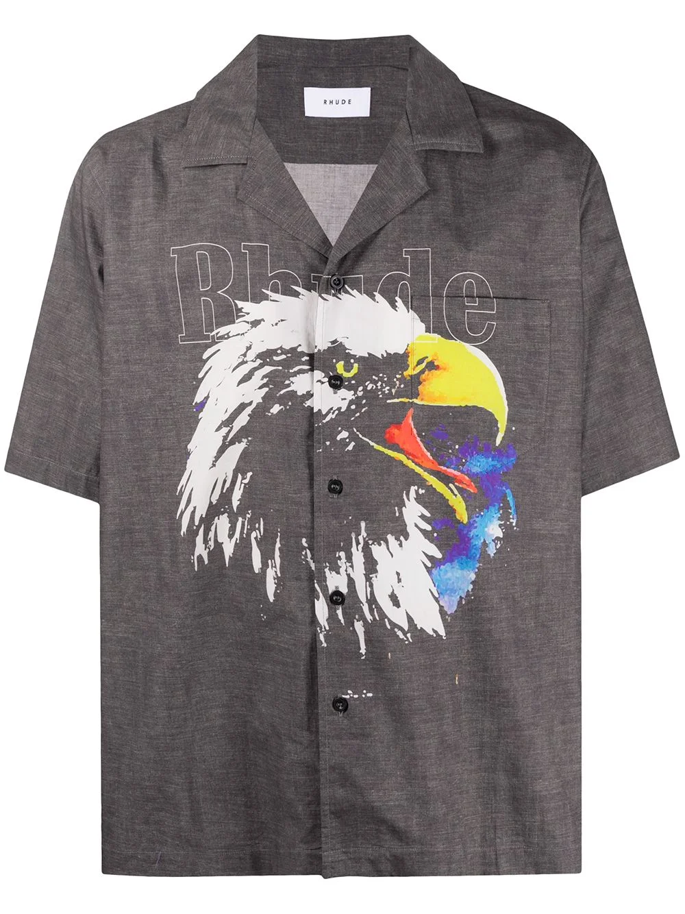 Eagle-print bowling shirt Charcoal-black cotton Eagle-print bowling shirt from rhude featuring a graphic print, a logo to the chest, notched lapels, short sleeves, a front button fastening and a straight hem. Made in Italy Composition Cotton 100% SIZE & FIT Model measurements Height 6 ft 2 in(1.89 m) Bust/Chest 37.79 in(96 cm) Hips 37 in(94 cm) Waist 29.92 in(76 cm) Measurement CHEST 44.48 in(113 cm) SLEEVE LENGTH 20.07 in(51 cm) Shoulder Width 17.32 in(44 cm) FittingInformation This piece fits true to size. We recommend you get your regular size Cut for a loose fit Made with a mid-weight non-stretch fabric Washing instructions Dry Clean Only