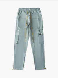 PREMIUM CARGO TROUSER WITH TWIN PATCH CARGO POCKETS WITH ZIP AT FRONT THIGHS ANDTWIN BACK CUSTOM POCKETS. CROPPED FIT.BUNGEE CUFF ANKLE OPENINGS. EXAGGERATED DRAWSTRINGS IN OUR SIGNATURE MUSTARD TONE, FEATURING CUSTOM RHUDE PILL HARDWARE ON ZIPPER CLOSURES. CARE 100% POLYESTER DRY CLEAN ONLY. SIZING STANDARD FIT. WE RECOMMEND TAKING YOUR STANDARD SIZE.