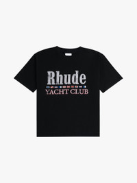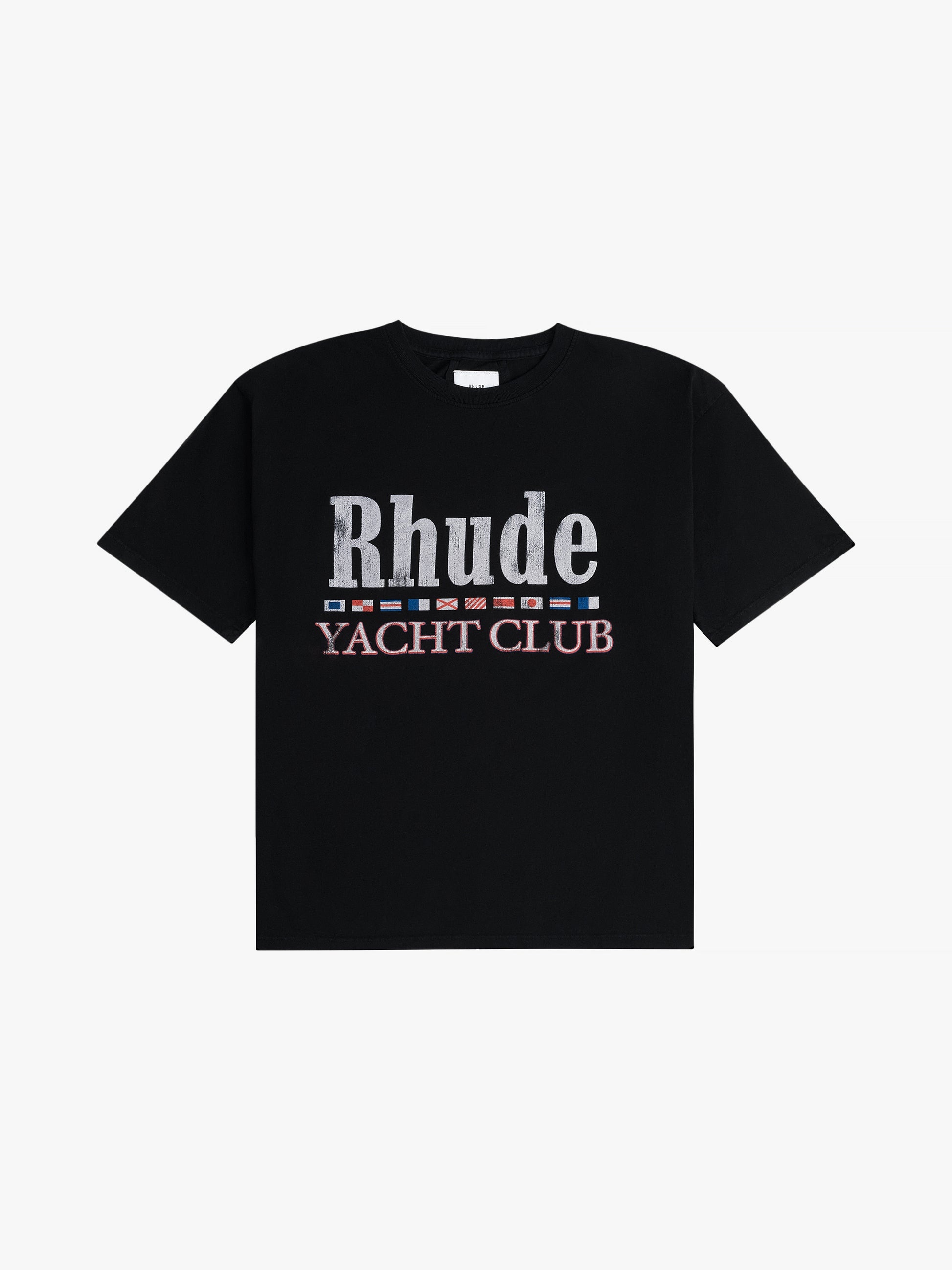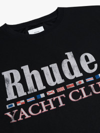 Custom-vintage fit cotton tee shirt with a ribbed neckline and short sleeves. Features RHUDE Yacht Club Flag designs printed on front.