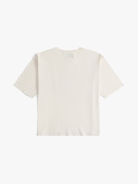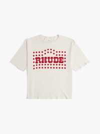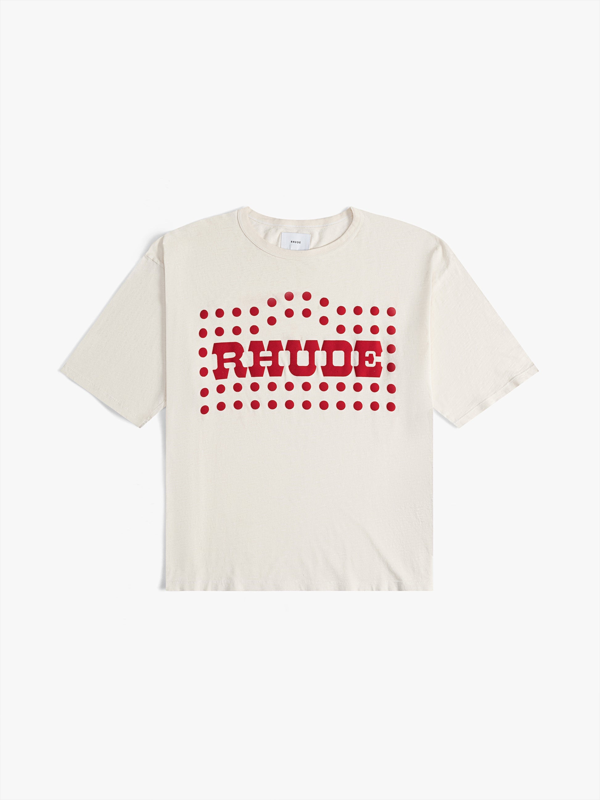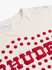 Custom-vintage fit cotton tee shirt with a ribbed neckline and short sleeves. Features RHUDE logo design on front created with a flocked detailing, adding a three-dimensional effect for a unique and textured look. AW23 RUNWAY PIECE CARE INSTRUCTIONS 100% COTTON DRY CLEAN ONLY WE RECOMMEND TAKING YOUR STANDARD SIZE