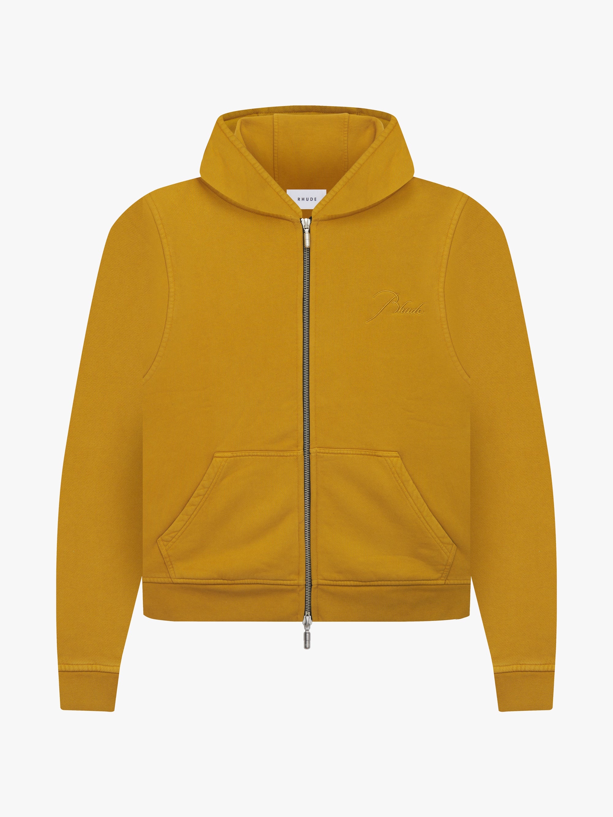 HEAVYWEIGHT FULL-ZIP HOODIE WITH SIGNATURE RHUDE SIGNATURE SCRIPT EMBROIDERED ON THE FRONT AND BACK. TWO-WAY ZIPPER CLOSURE WITH CUSTOM RHUDE PILL HARDWARE. CARE 100% COTTON MACHINE WASH COLD STANDARD FIT WE RECOMMEND TAKING YOUR STANDARD SIZE