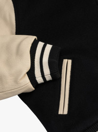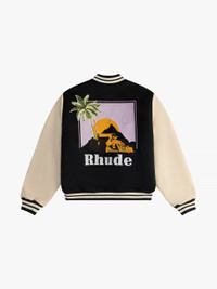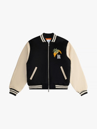 Premium leather varsity jacket with a cropped hem and custom Rhude two-way zipper closure. Features pill hardware, a stand collar, ribbed waist and cuffs. Designed in collaboration with The Webster. 100%WOOL/100%LEATHER Dry clean only. Standard fit. We recommend taking your standard size.