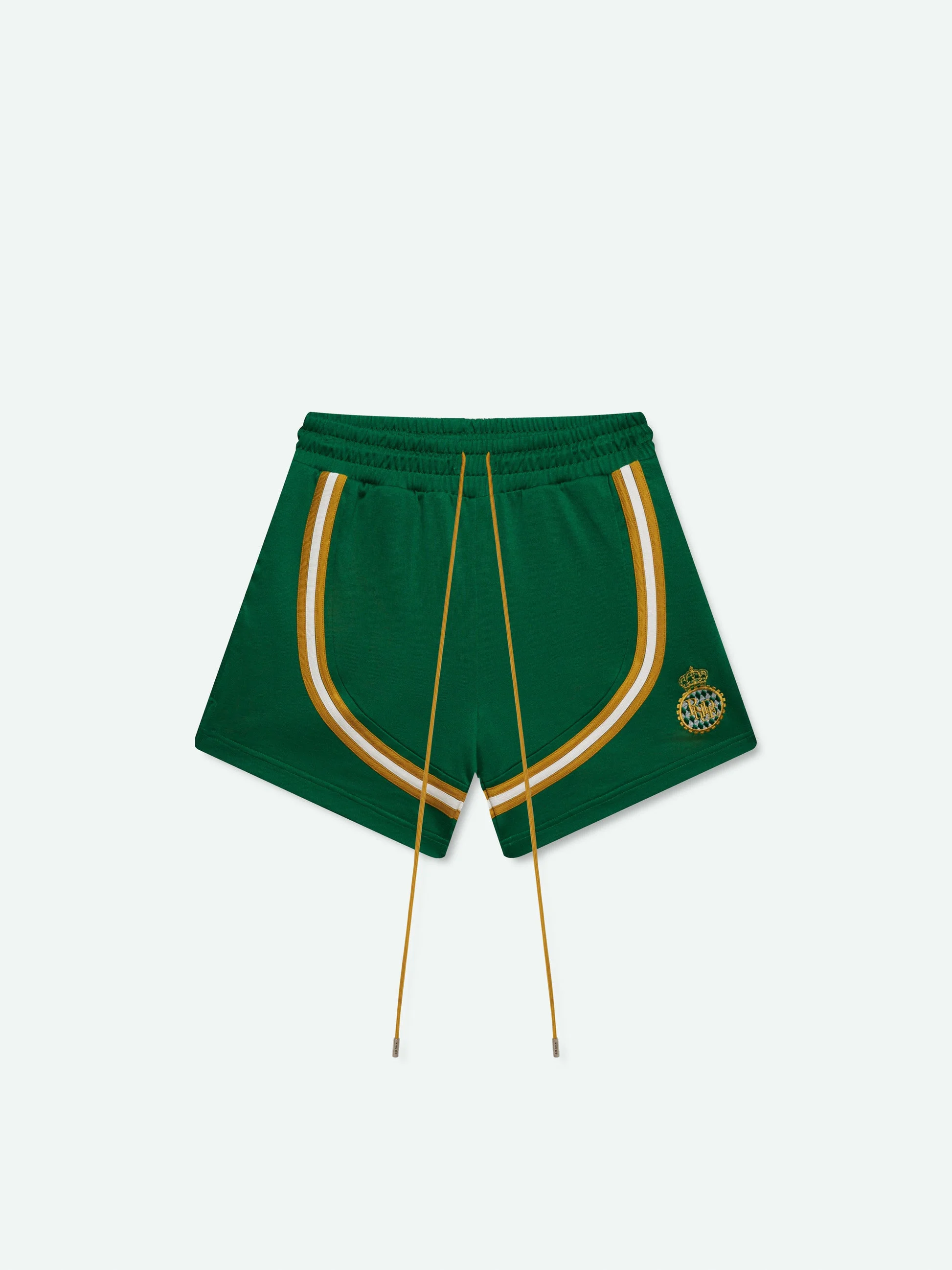Premium track shorts f eaturing Rhude crest embroidered on front leg, an elasticated waistband, twin side pockets, and exaggerated front drawstrings in our signature Mustard tone. 63% COTTON 37% RAYON