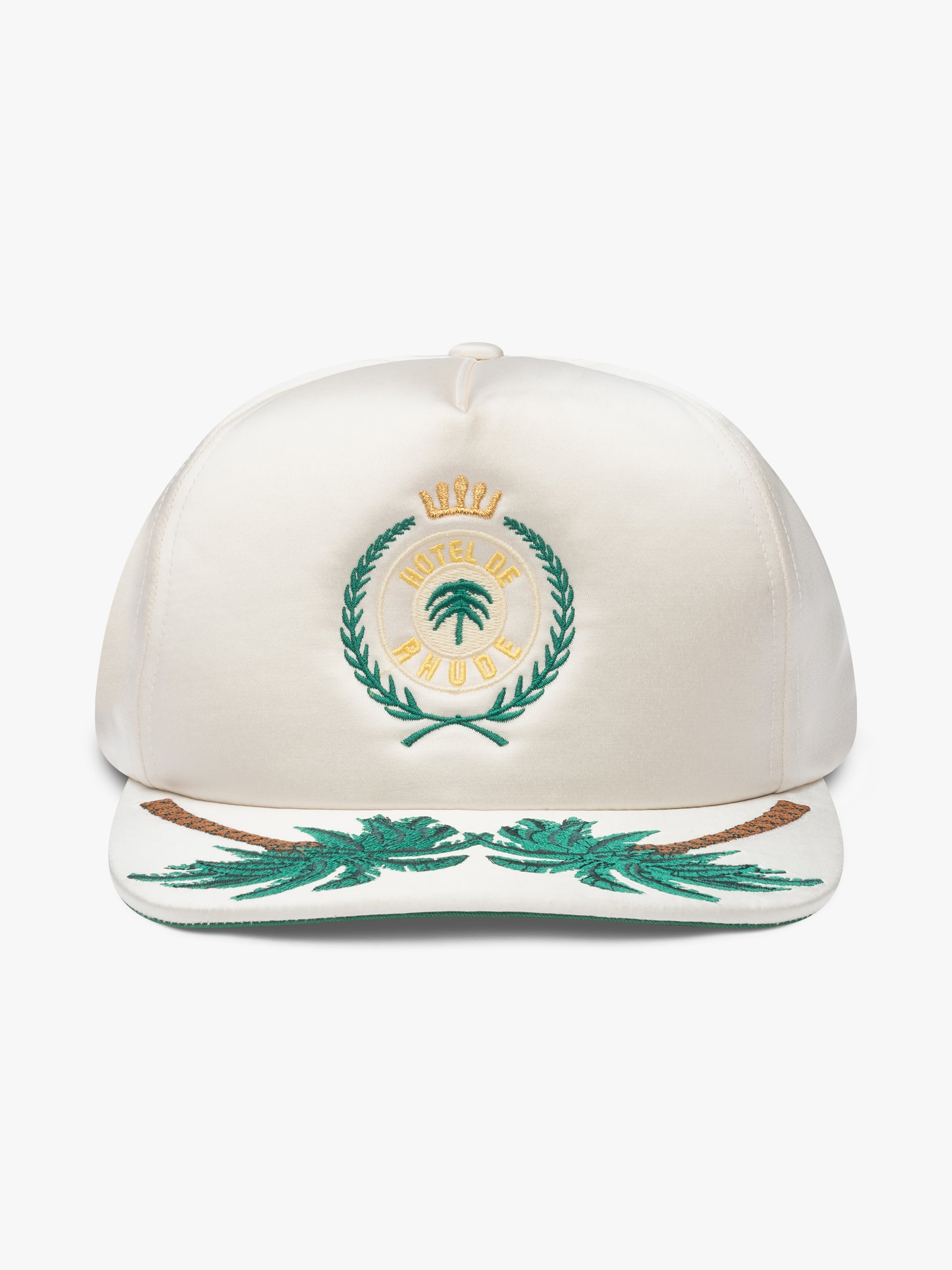 Heavyweight vintage trucker cap with Hotel de Rhude design embroidered on the front with palms on the bill. Back panel is constructed with a breathable mesh material. Features an adjustable strap at the back, so you can adjust the fit to your preference, and green under brim.