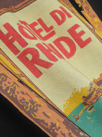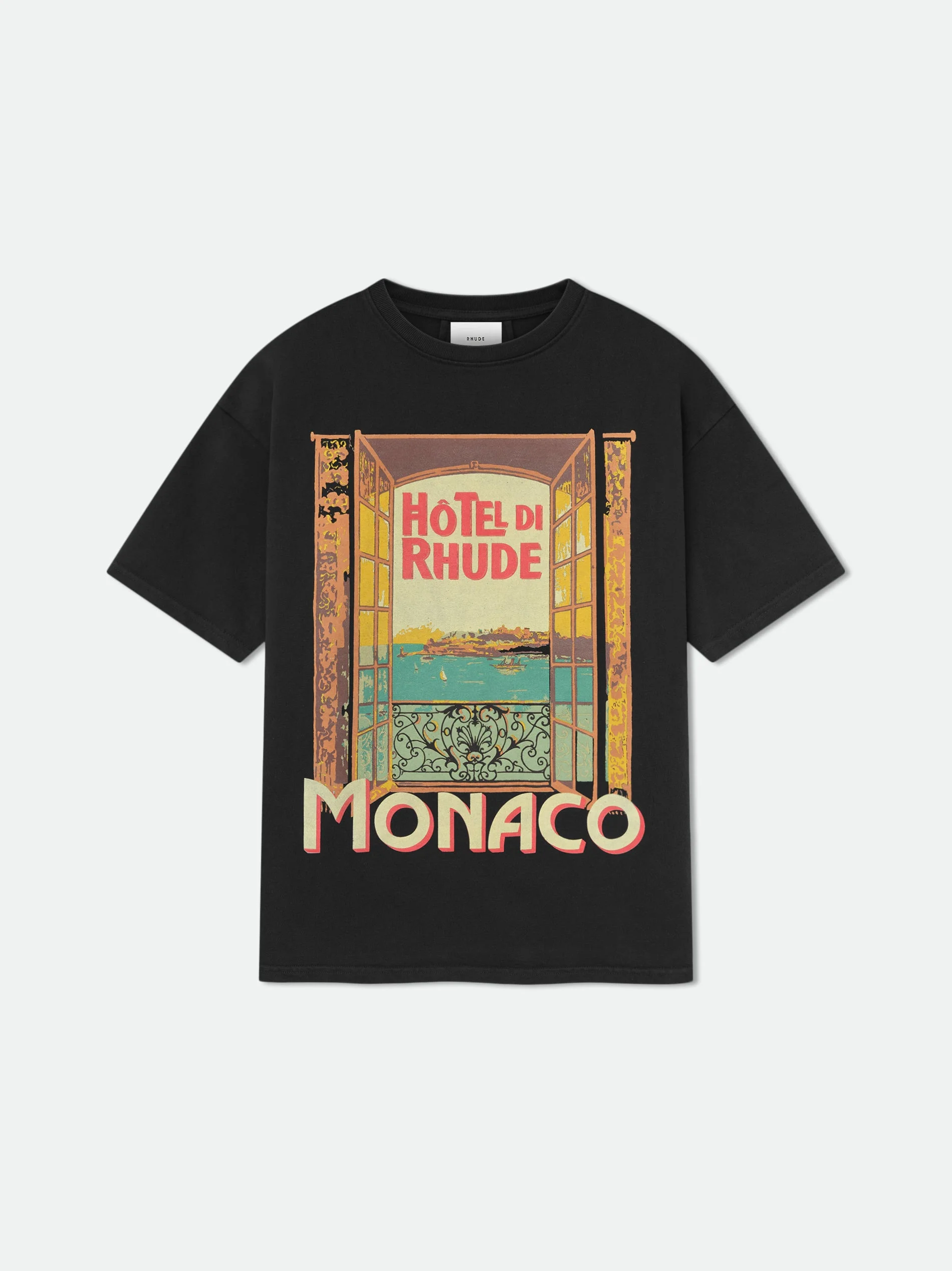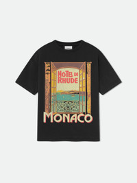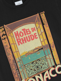 Custom-fit vintage wash cotton short sleeve tee-shirt features a ribbed neckline, with Rhude "Hotel di Monaco" inspired graphics printed at front, and with a clean back. 100% COTTON