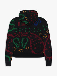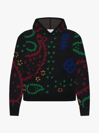 PREMIUM WOOL/CASHMERE BLEND HOODIE SWEATER. FEATURING AN ALL-OVER BANDANA PRINT WITH RIB-KNIT COLLAR, CUFFS, AND HEM. CUSTOM FIT WITH DROP SHOULDER SLEEVES AND PULL OVER STYLING. CARE 50% WOOL 50% CASHMERE DRY CLEAN ONLY. SIZING STANDARD FIT WE RECOMMEND TAKING YOUR STANDARD SIZE.