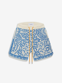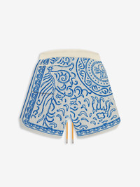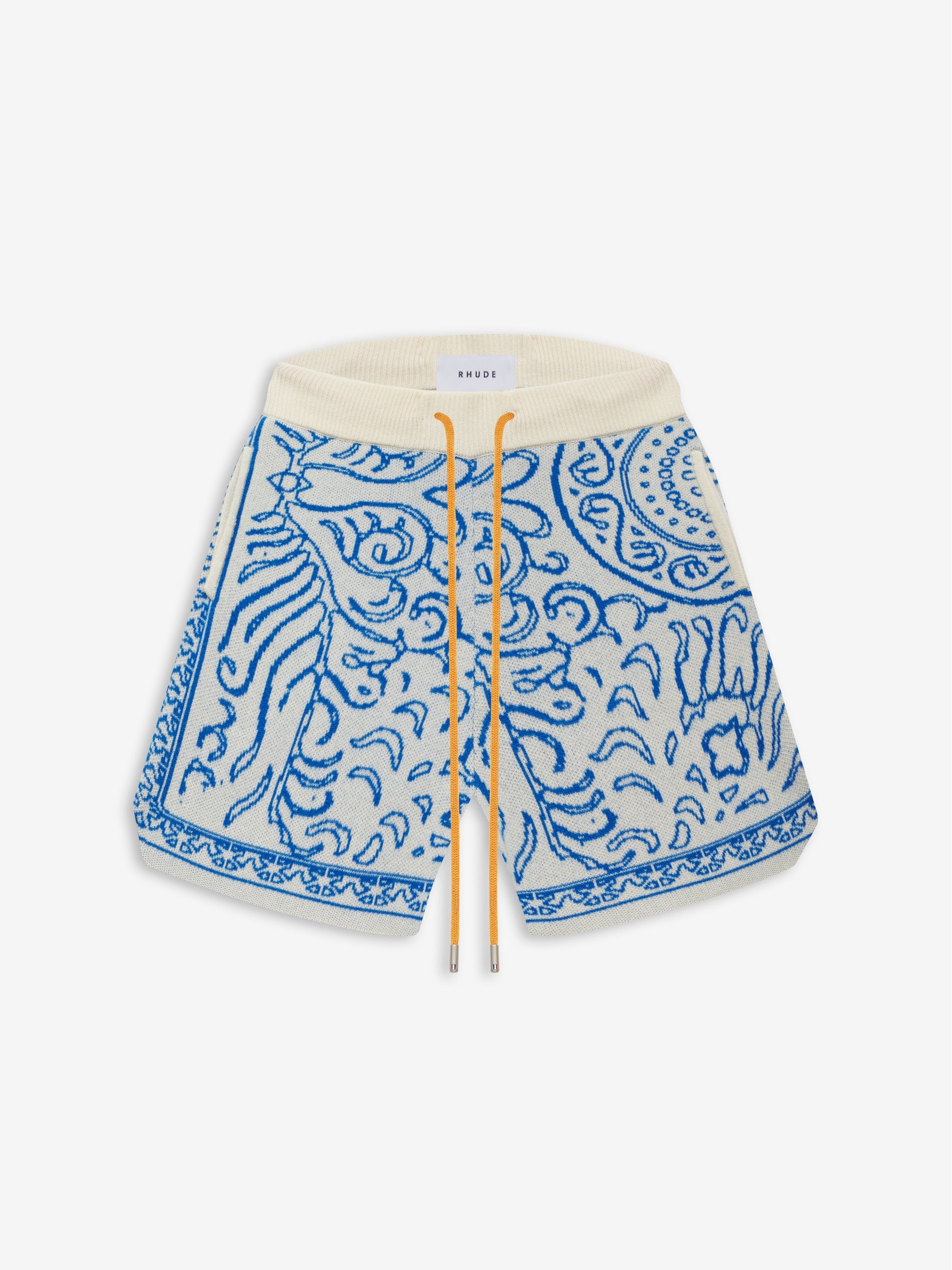 PREMIUM WOOL-COTTON BLEND SHORT WITH RHUDE ALL-OVER TILE DESIGN THROUGHOUT. FEATURING TWIN SIDE POCKETS, SINGLE BACK POCKET, AND EXTENDED DRAWSTRINGS IN OUR SIGNATURE MUSTARD TONE. CARE 50% WOOL / 50% COTTON DRY CLEAN ONLY SIZING STANDARD FIT WE RECOMMEND TAKING YOUR STANDARD SIZE