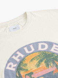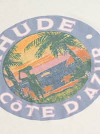 Custom-vintage fit cotton tee shirt with a ribbed neckline and short sleeves. Features RHUDE Lago - Cote D'Azur design printed on front. CARE INSTRUCTIONS 100% COTTON DRY CLEAN ONLY WE RECOMMEND TAKING YOUR STANDARD SIZE