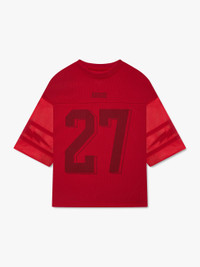 Premium tee crafted from soft, satin jersey. Rhude 27 graphic showcased on the front. Features a comfortable and relaxed custom Rhude football jersey fit. The multi stripe design on the sleeves adds a sporty touch to this classic short sleeve. 100% POLYESTER