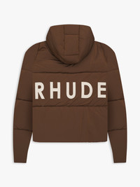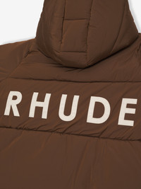 PREMIUM PUFFER JACKET IN BROWN FEATURING RHUDE LOGO ON BACK. TWIN POCKETS AT SIDES. TWO-WAY ZIPPER CLOSURE WITH CUSTOM RHUDE PILL HARDWARE. CARE 100% POLYESTER WE RECOMMEND TAKING YOUR STANDARD SIZE DRY CLEAN ONLY