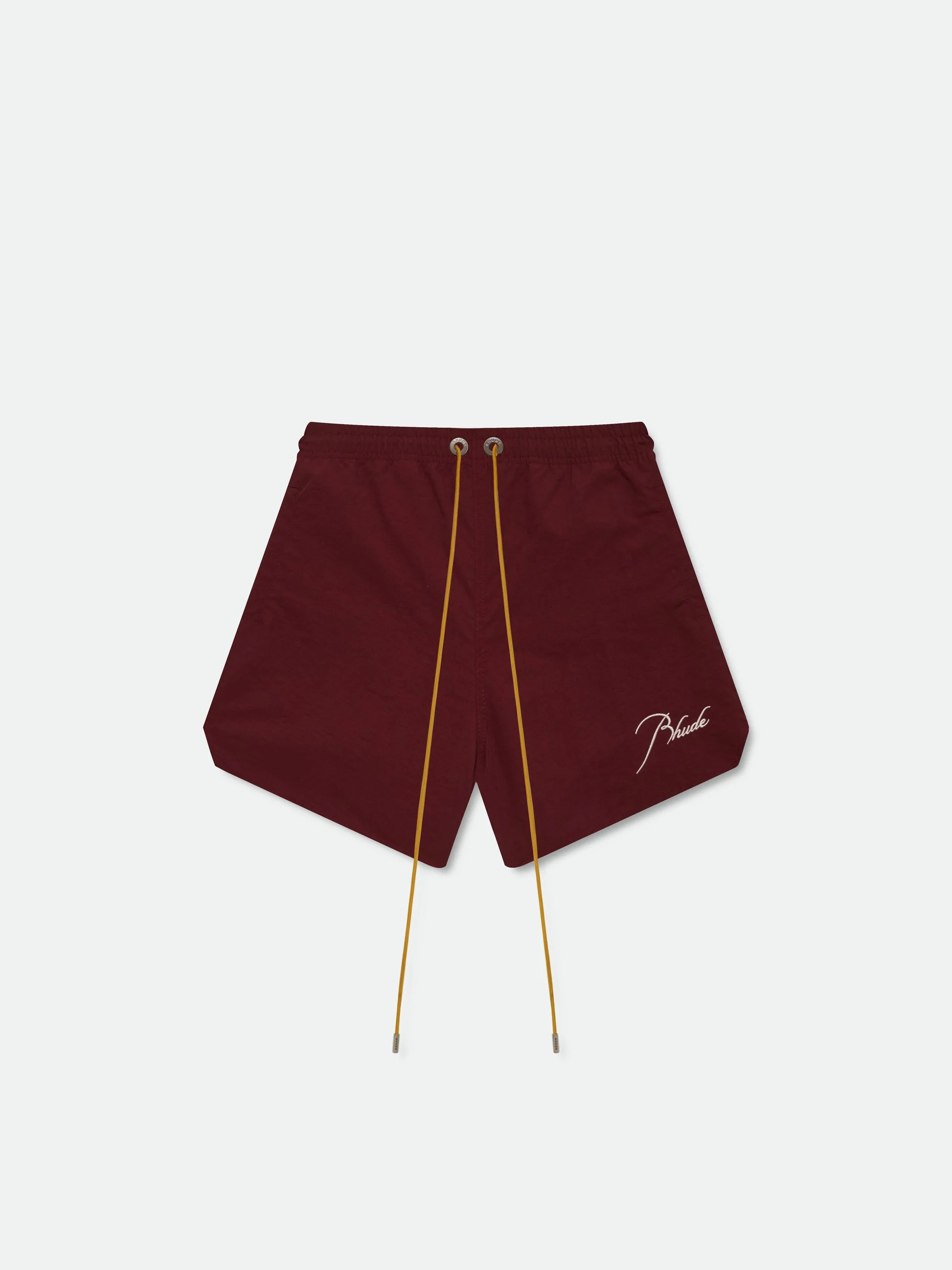 Premium swim shorts f eaturing Rhude script logo on front leg , an elasticated waistband, twin side pockets, and a custom Rhude chevron singular back pocket with an eyelet . Exaggerated front drawstrings in our signature mustard tone. 100% NYLON 85% NYLON, 15% SPANDEX