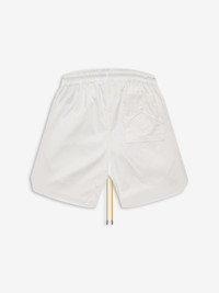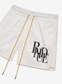 PREMIUM SWIM SHORTS WITH RHUDE SCRAMBLE LOGO PRINTED ON FRONT IN BLACK. FEATURING AN ELASTICATED WAISTBAND, TWIN SIDE POCKETS, AND SINGULAR BACK POCKET. EXAGGERATED FRONT DRAWSTRINGS IN OUR SIGNATURE MUSTARD TONE. CARE 100% NYLON WAISTBAND 65% RAYON 30% NYLON 5% SPANDEX WASH IN COLD WATER ON GENTLE CYCLE USING A BLEACH-FREE DETERGENT. SIZING STANDARD FIT. WE RECOMMEND TAKING YOUR STANDARD SIZE.