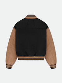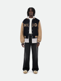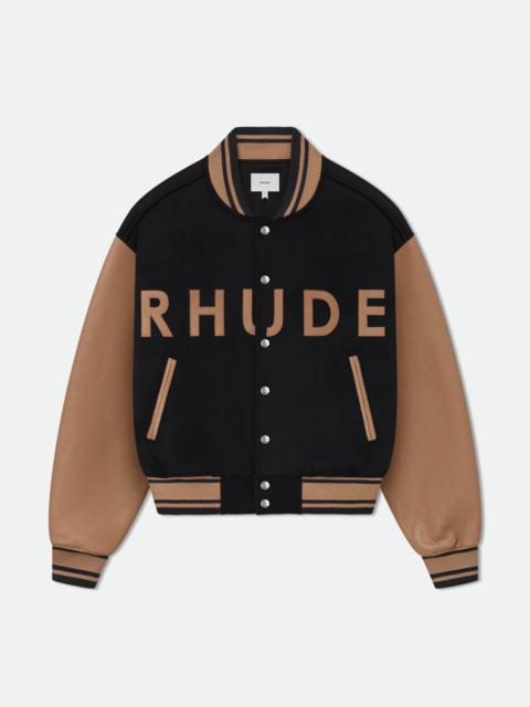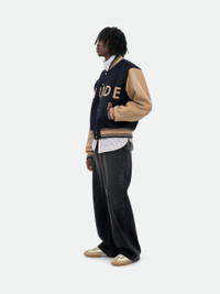 Premium Jacket features embroidered "RHUDE" lettering on the front, custom Rhude pill snap hardware for closure. Twin pockets at front. Features a ribbed collar, waist, and cuffs. SELF: 100% WOOL CONTRAST: 100% LAMBSKIN RIBBING: 100% POLYESTER LINING: 100% LYOCELL