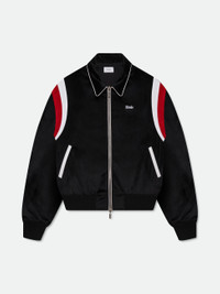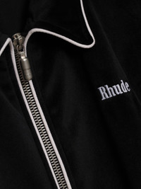 Velour track varsity jacket with Rhude logo on front, and a ppliques at each shoulder. Finished with a ribbed waist and cuffs for added comfort and style, along with c ustom two-way Rhude Pill zipper closure. 100% POLY 100% LYOCELL