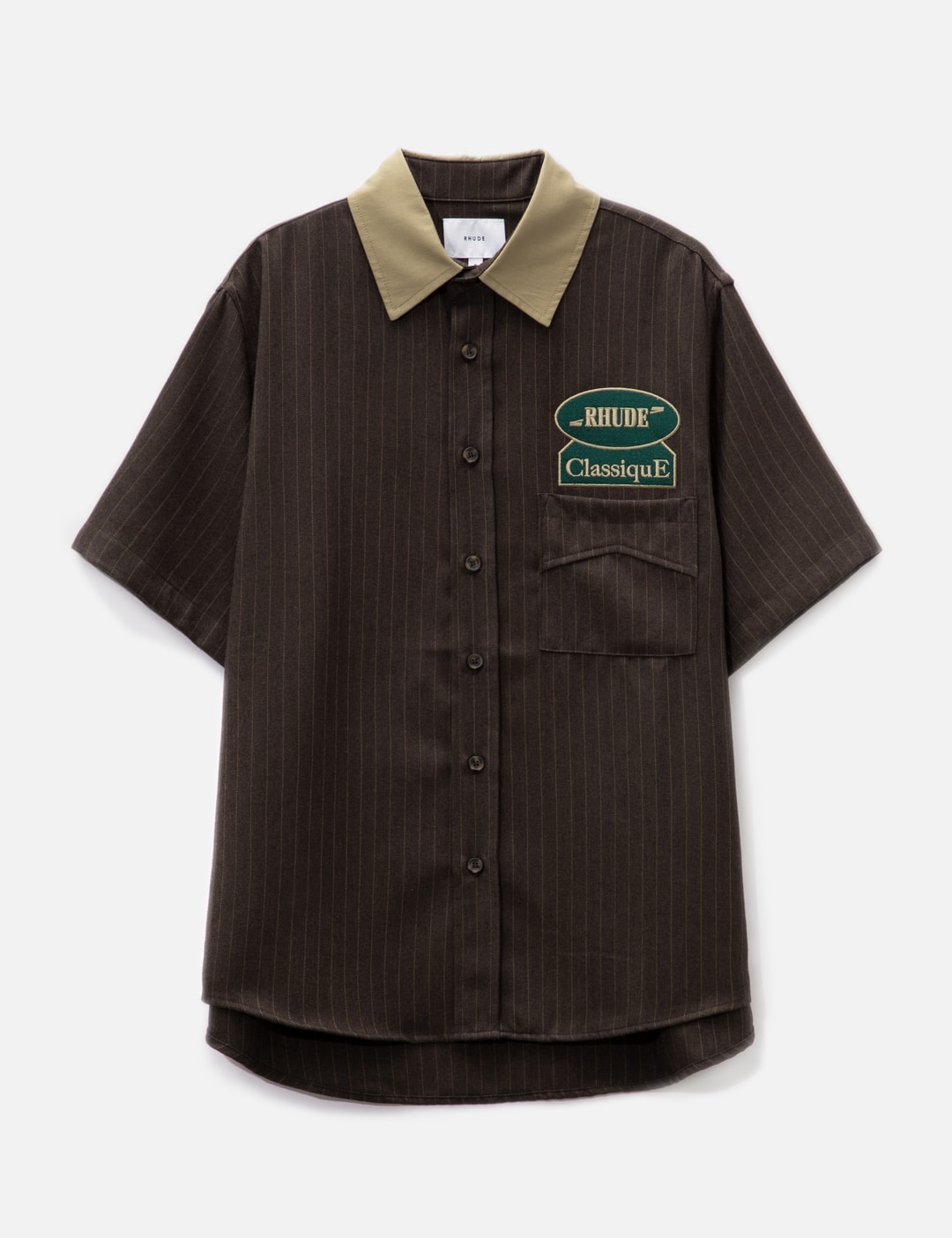 - Rhude - Mechanic Stripe Shirt - Polyester viscose blend twill fabric - Button closure - Spread collar - Chest patch pocket - Branded patch above chest pocket - Droptail hem - Color: Brown/Tan - Material: 65% Polyester, 35% Viscose - See more Shirts and Clothing SIZING - Model wears size M - Model measures: Height 187cm, Chest 37”/93cm, Waist 28”/71cm, Hip 37”/93cm