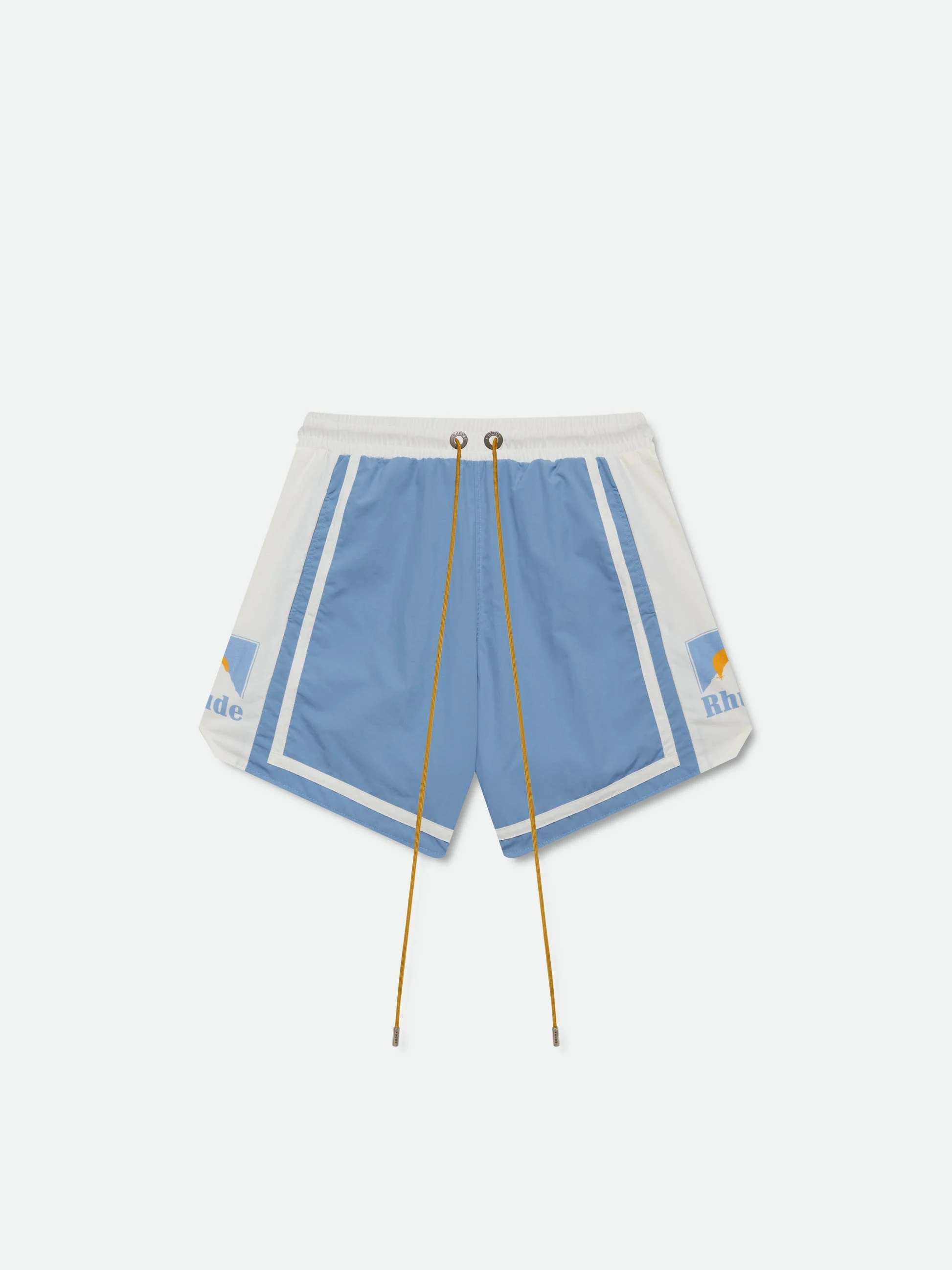 Premium track short with Rhude Moonlight Logo printed on each outer leg. Twin side pockets, singular back pocket, extended drawstrings in our signature mustard tone. SELF: 100% NYLON LINING: 100% POLYESTER