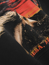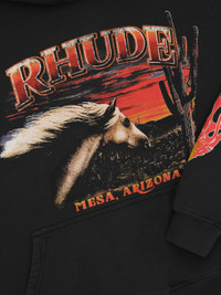 Long sleeve cotton heavyweight hoodie with Rhude "Mesa Stallion" graphic designs printed on the front and sleeves, with a clean back. Featuring a kangaroo front pocket and dropped shoulders. Each piece is unique and print distressing my vary per style. 100% COTTON