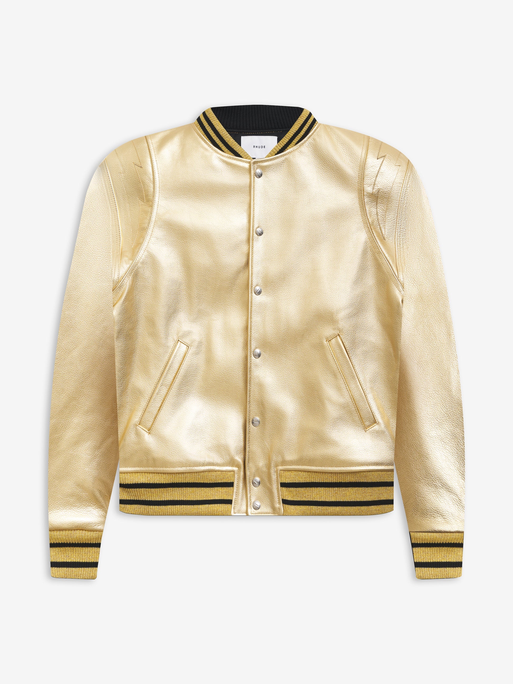 AW23 RUNWAY Premium Lightning Bomber Jacket, meticulously crafted from top-tier leather. This exceptional piece showcases a pair of matching lightning bolt appliques adorning each shoulder. Equipped with dual front pockets and customized RHUDE snap closures. Features a ribbed collar, waist, and cuffs. SIZING STANDARD FITWE RECOMMEND TAKING YOUR STANDARD SIZE