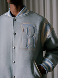 Premium wool varsity jacket f eatures Rhude Lightning Bolt Applique at each shoulder, R patch on front, twin front pockets, a cropped hem, a ribbed collar, waist and cuffs. Custom rhude snap pill closures.