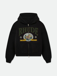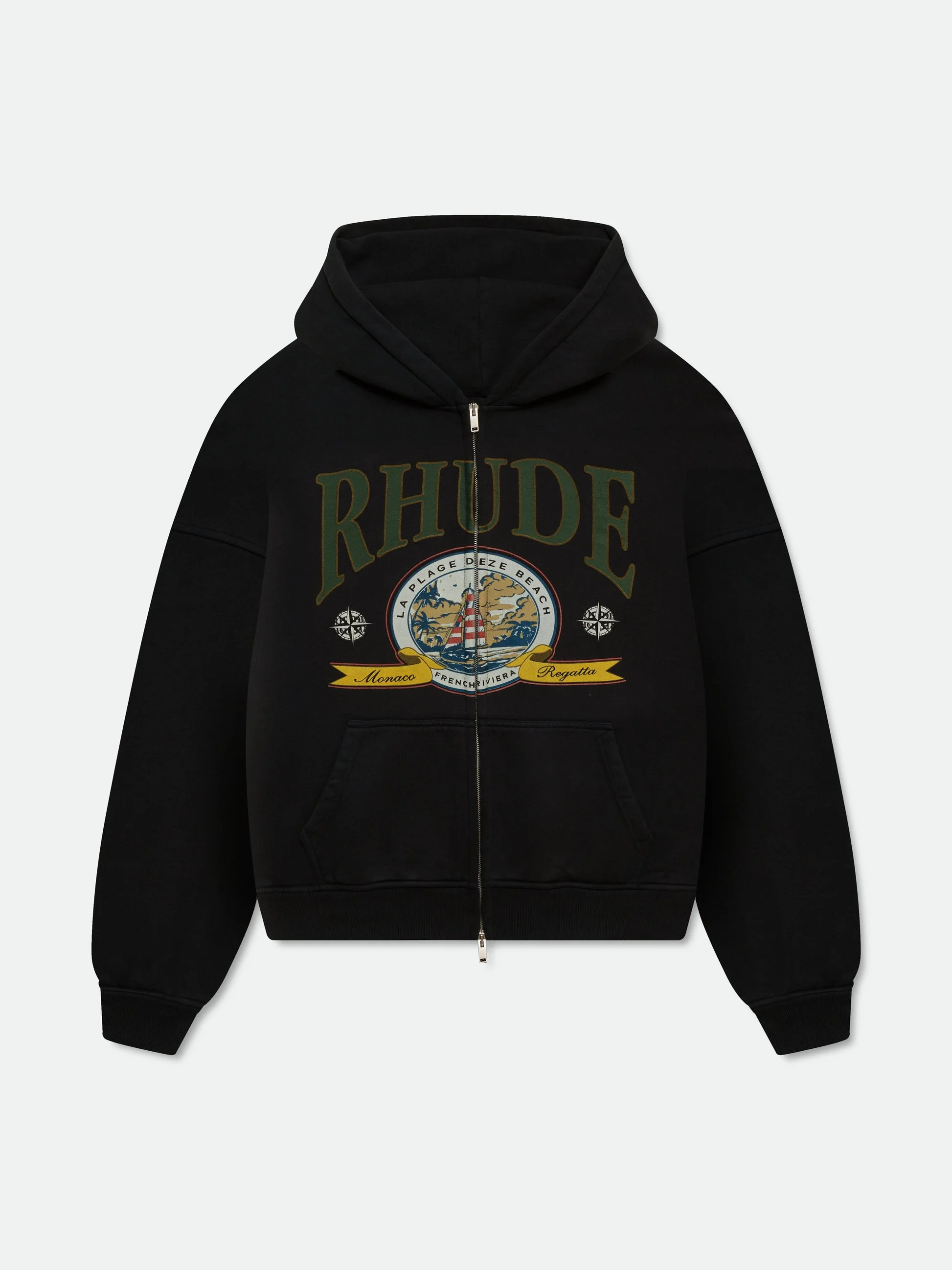 Heavyweight full-zip cotton hoodie showcases RHUDE signature logo on the front, with Monaco Regatta design on the front, and features a two-way zipper closure with custom Rhude Pill Hardware. 100% COTTON