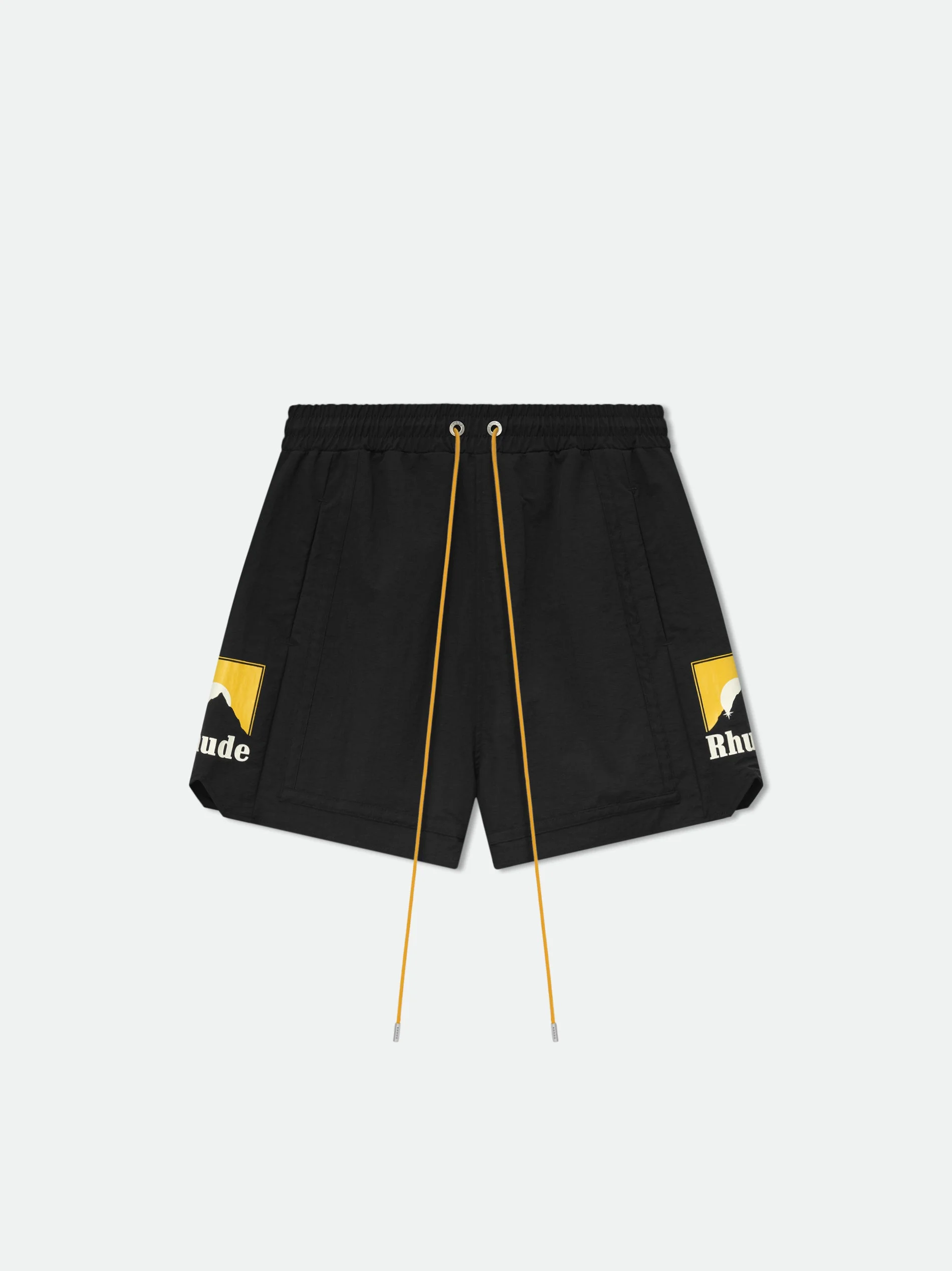 Premium track short with Rhude Moonlight Logo printed on each outer leg. Twin side pockets, singular back pocket, extended drawstrings in our signature mustard tone. SELF: 100% NYLON LINING: 100% POLYESTER