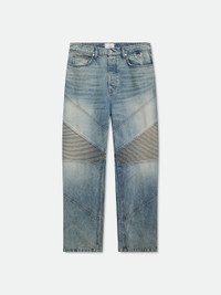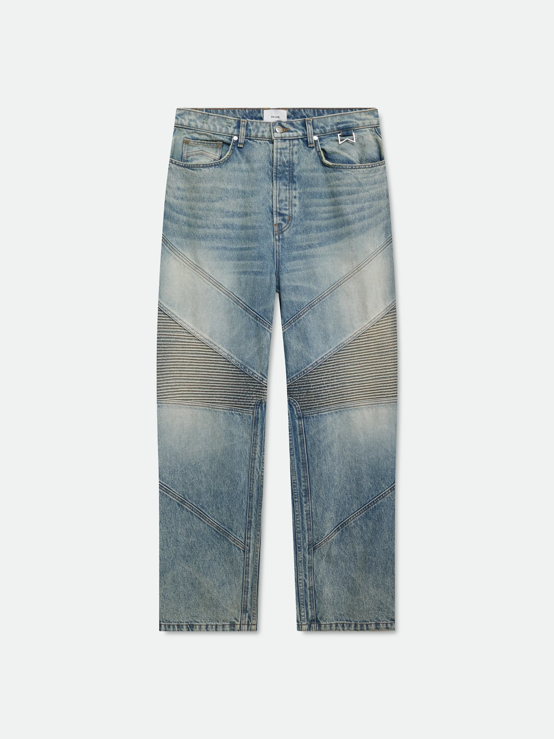 Classic moto wide leg cotton denim Jeans, designed with a mid rise and a wide leg silhouette that exudes timeless style. Features signature traxedo detailing down the leg. Pants are adorned with custom Rhude Closure button, zip fly, and hardware. 100% COTTON