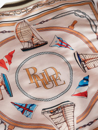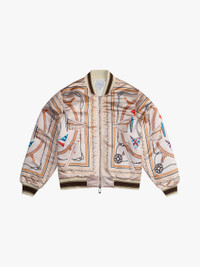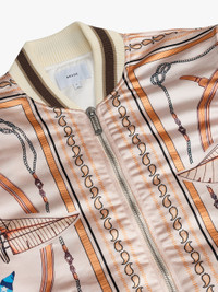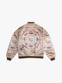 Premium zip-up satin bomber jacket adorned with distinctive Rhude nautical designs throughout. Features a custom Rhude two-way zipper closure, accented with pill hardware for added flair. Finished with ribbed collar, waist and cuffs, this jacket exudes both style and sophistication.
