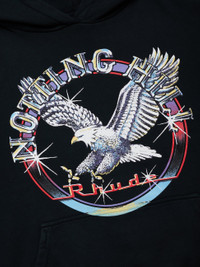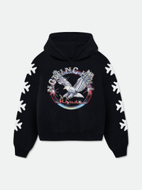 Long sleeve French Terry hoodie with Rhude notting hill eagle graphic designs printed on the front and sleeves, with a clean back. Featuring a kangaroo front pocket and dropped shoulders. Each piece is unique and print distressing my vary per style. 100% COTTON