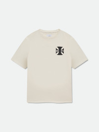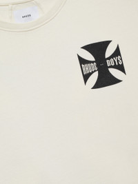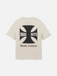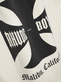 Custom-fit vintage wash cotton short sleeve tee-shirt with Rhude "Rhude Boys, Malibu CA" graphics printed at front and back. 100% COTTON