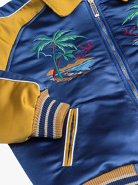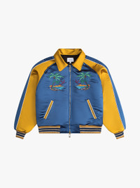 Premium Souvenir Jacket features embroidered designs on front and back, throughout the jacket. Two way zipper closure with custom Rhude pill hardware. Twin pockets at front. Features a ribbed collar, waist, and cuffs. SIZING STANDARD FITWE RECOMMEND TAKING YOUR STANDARD SIZE