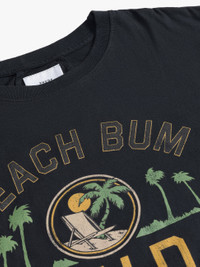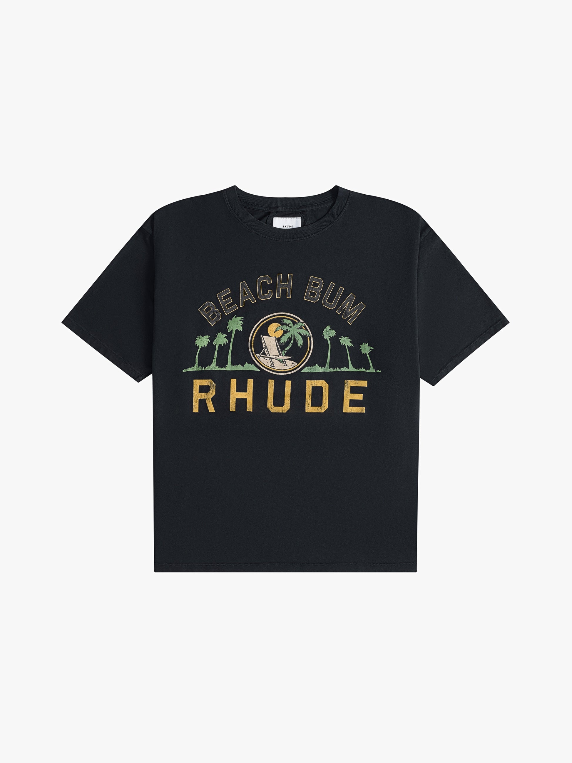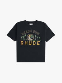 Custom-vintage fit cotton tee shirt with a ribbed neckline and short sleeves. Features RHUDE Beach Bum design printed on front. CARE INSTRUCTIONS 100% COTTON DRY CLEAN ONLY WE RECOMMEND TAKING YOUR STANDARD SIZE
