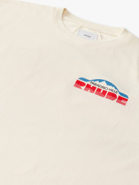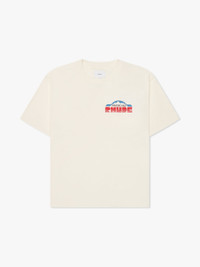 Custom-vintage fit cotton tee shirt with a ribbed neckline and short sleeves. Features RHUDE Paradiso Rally design printed on front chest and back. CARE INSTRUCTIONS 100% COTTON DRY CLEAN ONLY WE RECOMMEND TAKING YOUR STANDARD SIZE