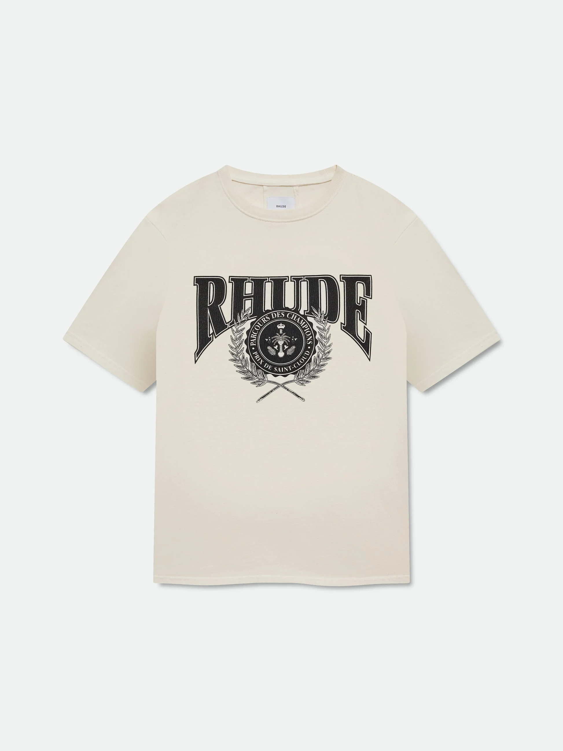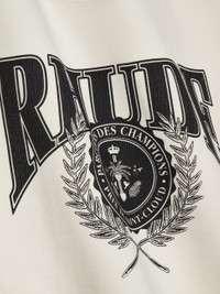 Custom-fit vintage wash cotton short sleeve tee-shirt with Rhude "Parcours Des Champions " graphics printed at front, with a clean back. 100% COTTON
