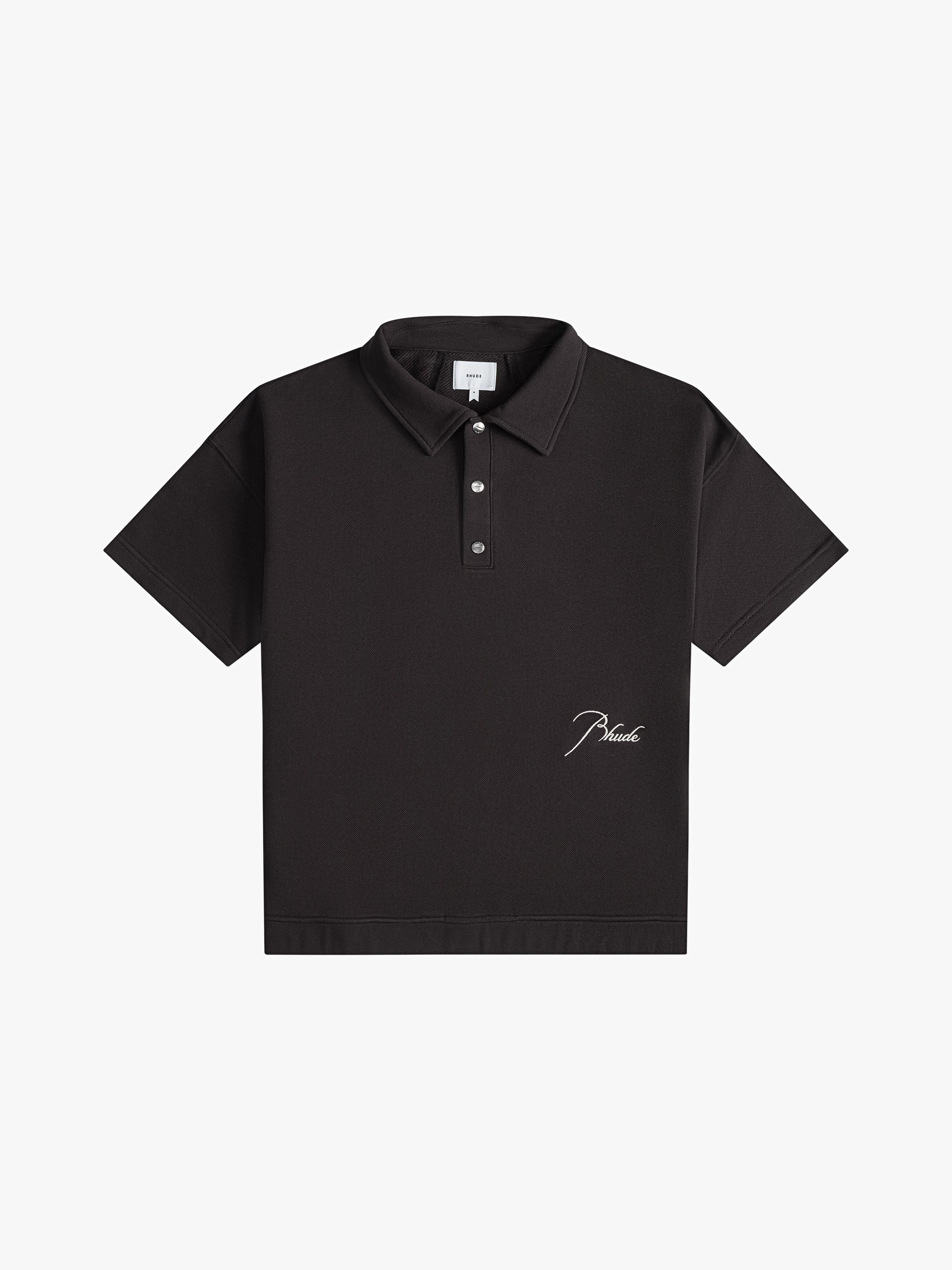 Premium track polo made from stylish pique cotton for a refined aesthetic and enhanced comfort. The 1x1 ribbing on the collar and cuffs provides a comfortable and secure fit. Features quarter front opening at collar, with custom Rhude closures, and front twin side pockets. CARE INSTRUCTIONS SELF: 50% COTTON, 50% POLYESTER Dry clean only. SIZING Standard fit. We recommend taking your standard size.