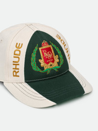 Heavyweight vintage 6-panel hat with Rhude crest design on the front panel. Features an adjustable strap at the back with custom rhude hardware, so you can adjust the fit to your preference, and green under brim. 100%POLYESTER / 65% POLY 35% COTTON TWILL