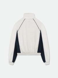 Premium track jacket features a sleek stand collar and a versatile two-way zip closure. RHUDE classique logo is displayed on the chest, while contrasting diagonal piping adds a dynamic touch. Practical welt pockets offer convenient storage, and the elasticized hem and cuffs ensure a comfortable, secure fit. Fully lined for added warmth and structure, making it a stylish and functional piece. 100% LINEN