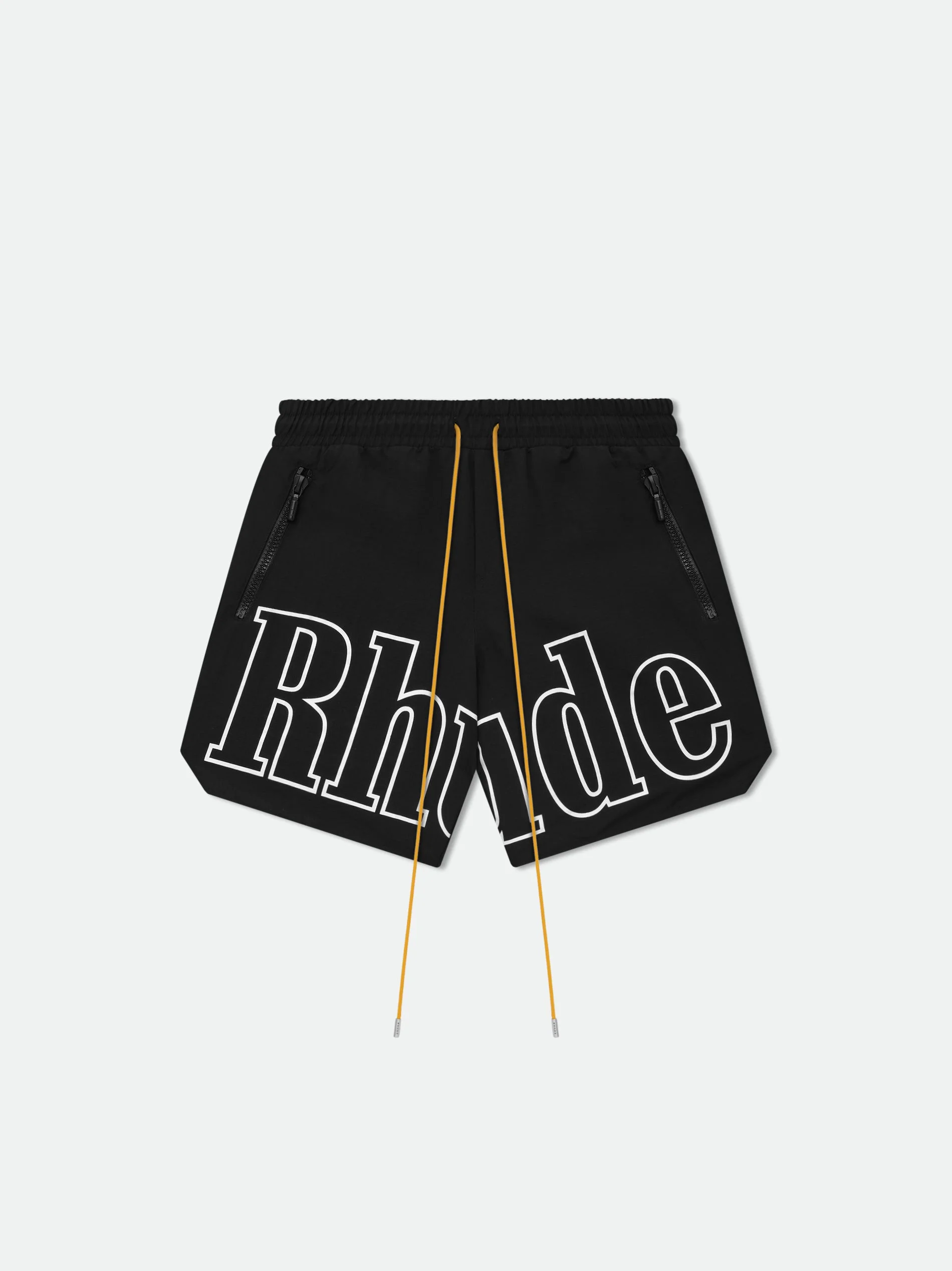 PREMIUM WASHED NYLON SHORT WITH LOGO PRINT ACROSS FRONT LEGS. TWIN ZIPPER POCKETS WITH MATCHING TONAL RHUDE PILL HARDWARE. EXTENDED DRAWSTRINGS IN OUR SIGNATURE MUSTARD TONE. CARE 100% NYLON DRY CLEAN ONLY SIZING STANDARD FIT WE RECOMMEND TAKING YOUR STANDARD SIZE