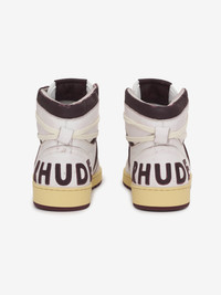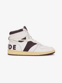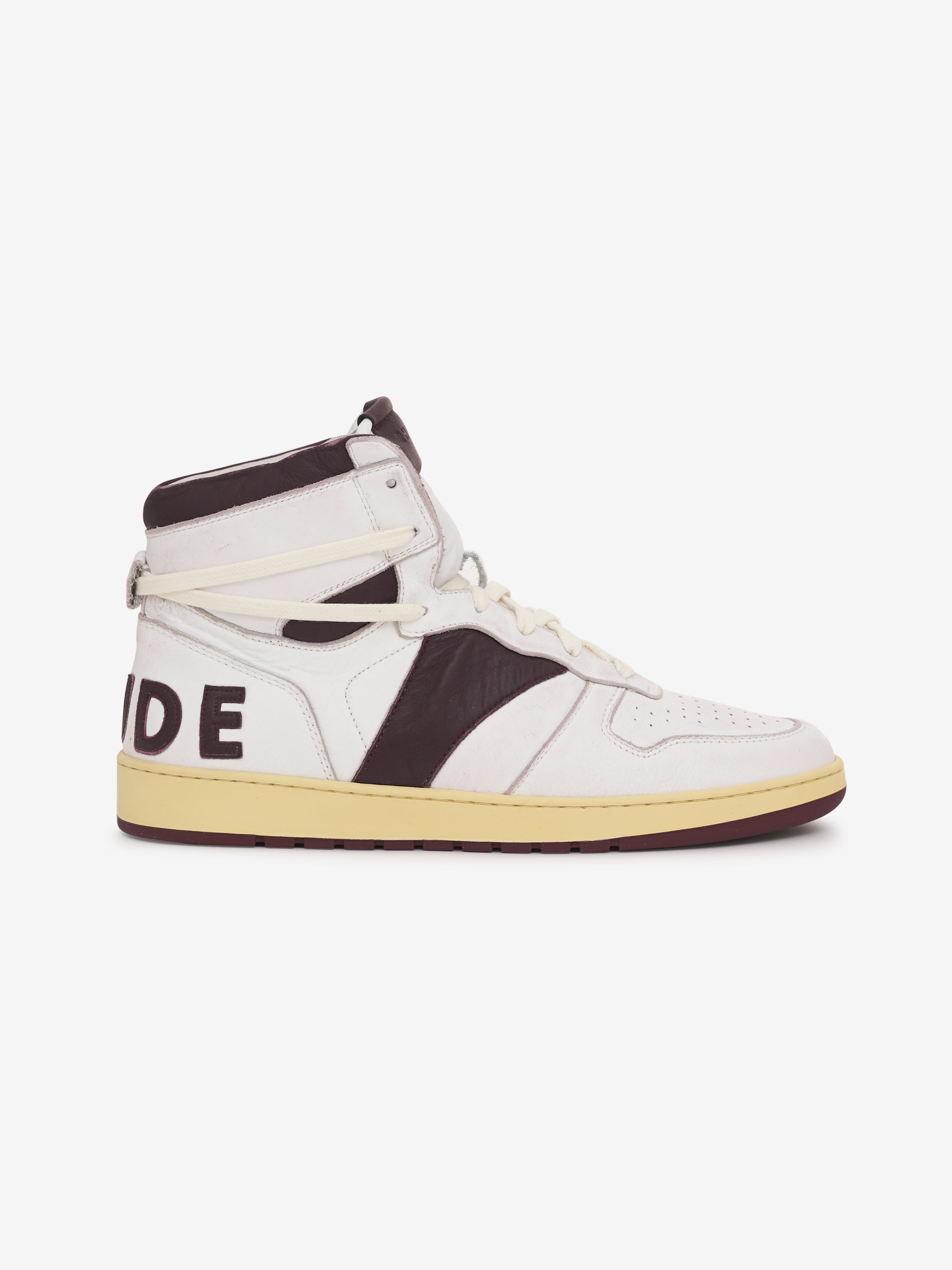 HIGH TOP LEATHER BASKETBALL SNEAKER HAND MADE IN ITALY WITH VINTAGE DETAILS. HAND DISTRESSED ABRASIONS AND IMPERFECTIONS THROUGHOUT. VINTAGED YELLOW SOLE. LEATHER LOGO HEEL APPLIQUE. CARE RUBBER SOLE, 85% UPPER CALF LEATHER 15% UPPER POLYETHERANE 100% LINING PIG LEATHER