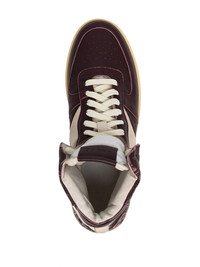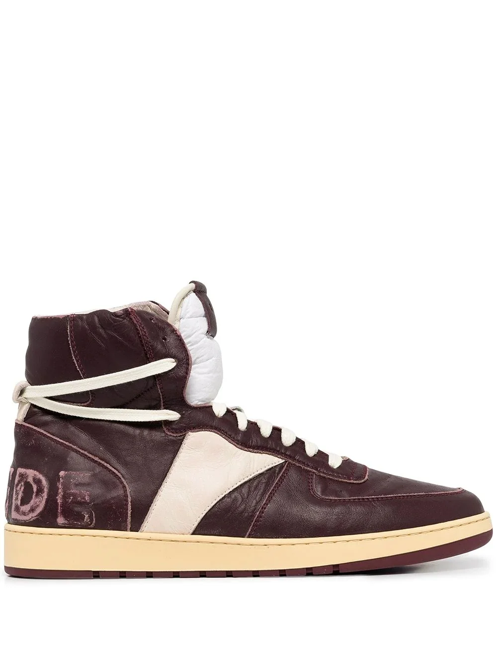 Rhecess high top sneakers maroon red leather distressed finish logo print to the rear logo patch at the tongue front lace-up fastening round toe flat rubber sole branded insole Made in Italy Composition Body: Leather 100% Sole: Rubber 100%