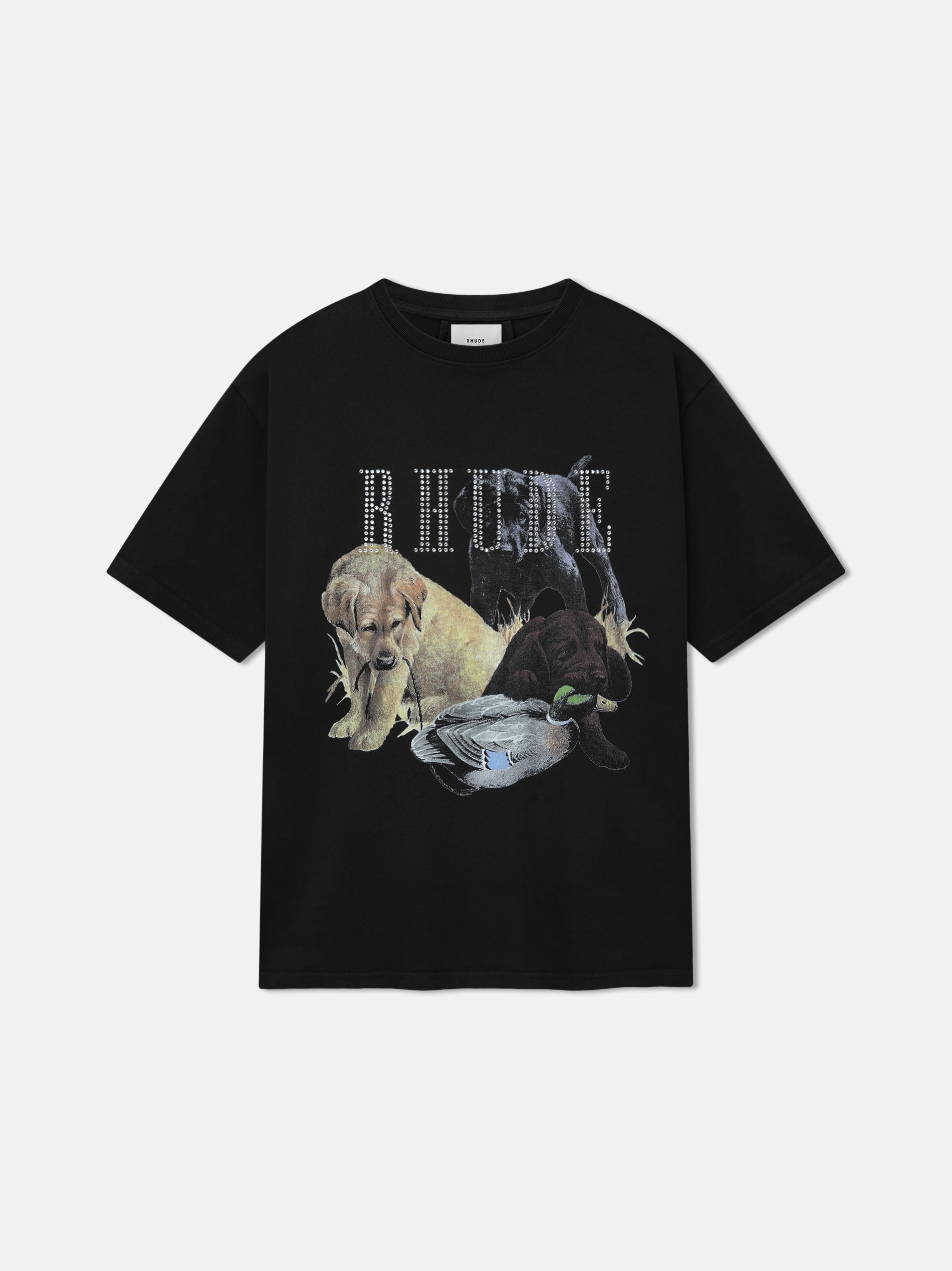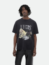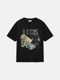 Custom-fit vintage wash cotton short sleeve tee-shirt features Rhude logo embellished with rhinestones, printed graphics printed at front, with a clean back. 100% COTTON
