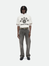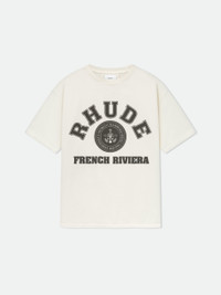 Custom-fit vintage wash cotton short sleeve tee-shirt with Rhude French Riviera graphic printed on the front, with a clean back. 100% COTTON